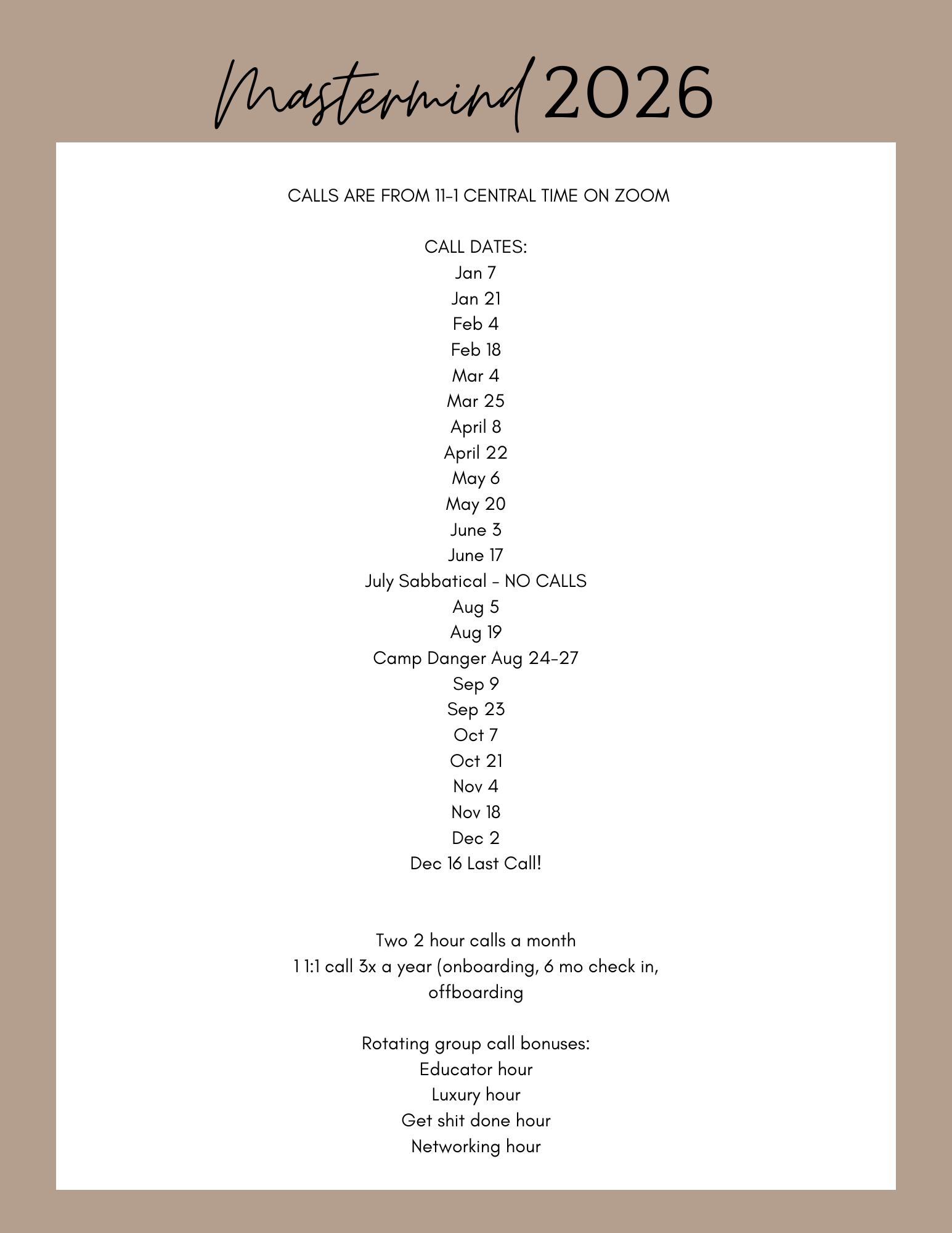 2 two hour Wednesday group calls per month except July.